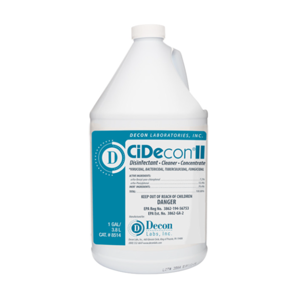 CiDecon II is a concentrated, phosphate-free detergent enhanced disinfectant formulated for use on lab surfaces and equipment where broad-spectrum disinfection is required.